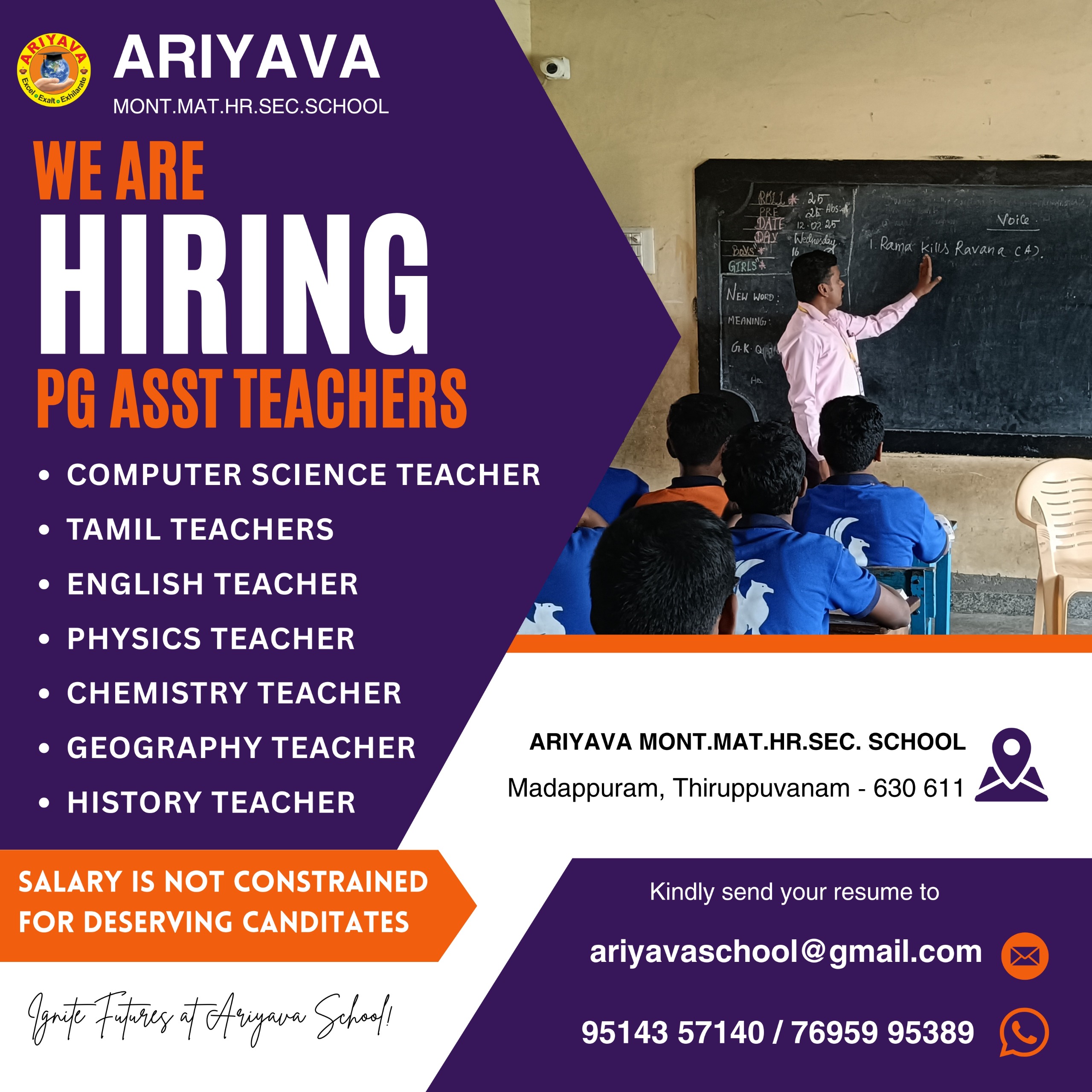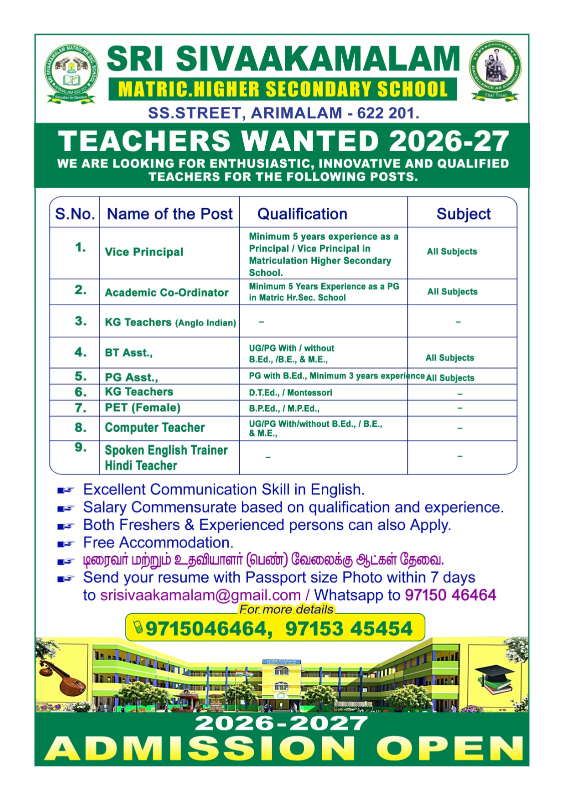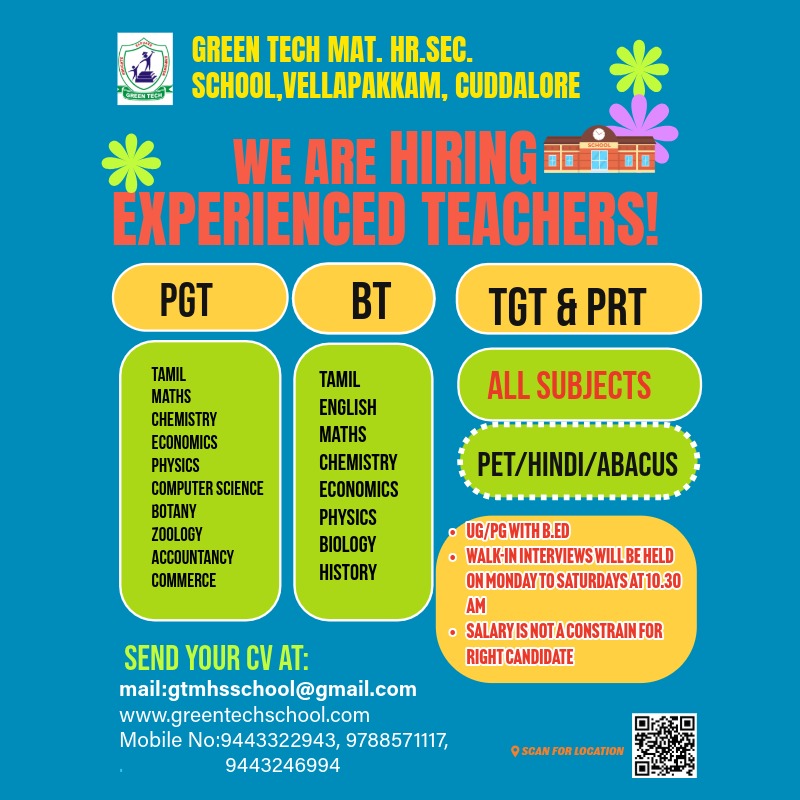 Wanted: Tamil, English, Maths, Physics, Hindi, Chemistry, Biology, EVS, Social, Science, P.E.T., ACCOUNTANCY, HISTORY, commerce, COMPUTER SCIENCE, Economics, Montessori, All Subjects